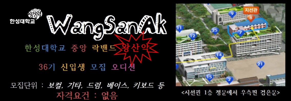 한성대학교 중앙 락밴드 ‘왕산악’은 한성대학교 뒤편에 자리잡고 있는 낙산의 왕이 되자는 의미를 거꾸로 뒤집어 만든 말로서 올해로 36년의 긴 역사를 자랑하는 전통 있는 동아리입니다. 지금껏 대학가요제, 동두천 락페스티벌 등 다양한 가요제에서 수상을 하였고 다양한 대외 행사를 통해서 대학 동아리로서의 인지도가 높습니다. 또한 일반 동아리에서 찾아볼 수 없는 수준의 최상급 합주실을 구비하고 있어 따로 합주실을 대여할 필요 없이 원할 때 음악을 할 수 있습니다. 이같은 시설은 36년간 학교의 지원 및 각종 대외행사, 그리고 졸업동문회에서 마련한 자금으로 꾸준히 마련한 것이며 왕산악의 자부심입니다. 대학 동아리 수준을 넘어서는 시설과 좋은 사람들로 가득한 동아리, 바로 그것이 한성대학교 중앙 락밴드 왕산악입니다.
