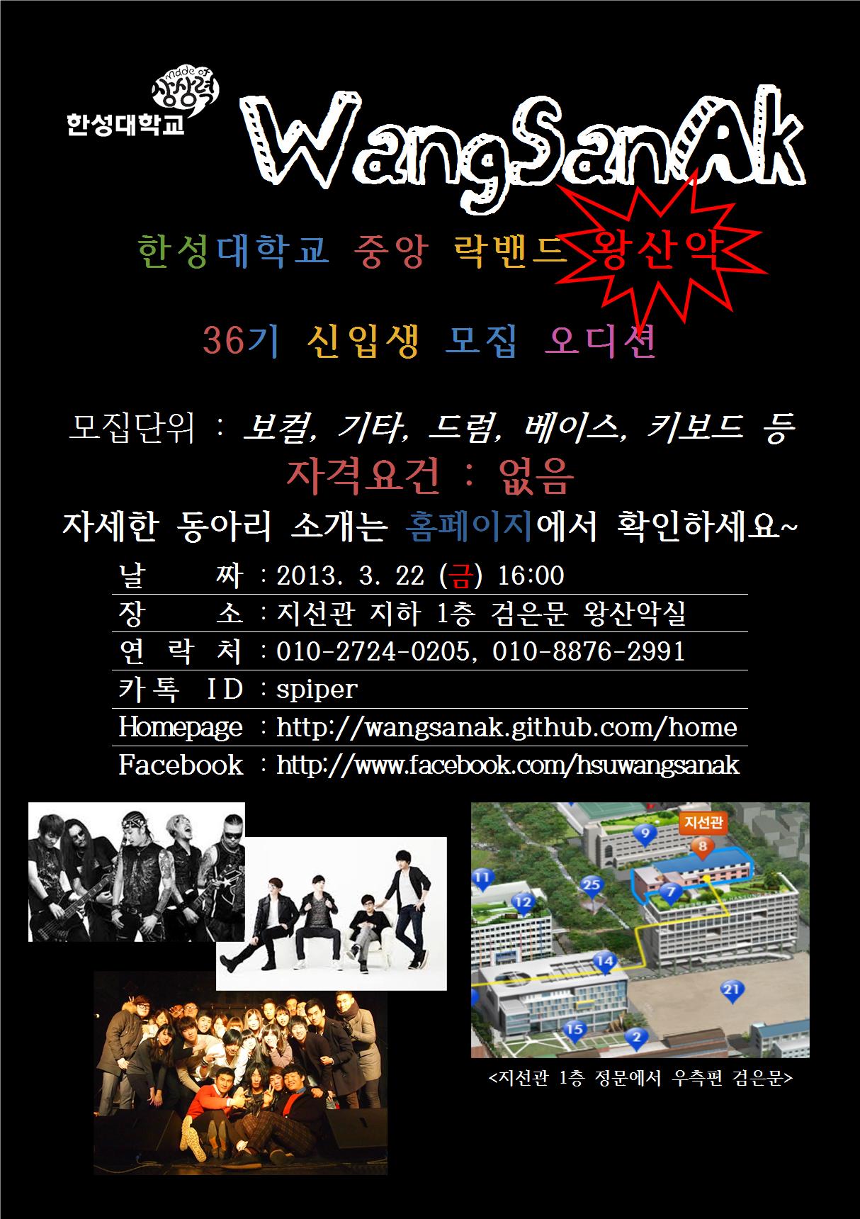 올해로 36번째가 되는 왕산악에서 신입생을 뽑고 있습니다. 날짜는 3월 22일 금요일 16시부터 오디션을 시작하고 지원단위는 보컬, 베이스, 기타, 드럼, 키보드로서 일반 밴드 구성과 같습니다. 밴드 오디션이라고 해서 다소 부담을 가지시는 분들이 많은데요, 왕산악에 들어오는데 있어서 실력은 그리 큰 비중을 차지하는 부분이 아닙니다. 실제로 왕산악에 들어오는 신입생들 중 대다수는 악기에 대한 아무런 소양 없이 들어오곤 합니다. 오디션에서는 실력보다는 동아리 활동에 대한 열정과 음악에 대한 관심을 더욱 큰 비중으로 두고 있습니다. 음악적으로도 완성된 모습이라면 좋겠지만 그것은 배워나가면 해결되는 것이고 서로 즐겁게 지내는 것이 더욱 중요하다고 생각하기 때문입니다. 요새 취업에 대한 각종 부담 때문에 동아리 활동을 꺼리시는 분들이 많다고 생각합니다. 하지만 왕산악에 시간을 투자하게 된다면 남들에게 자랑할 수 있는 취미를 갖게 되고 자기 발전의 또 다른 형태를 이룰 수 있다고 생각합니다. 그것이 꿈으로 이어질 수도 있고요. 또한 단순히 음악적인 분야뿐 아니라 사회 다방면에서 활동하고 있는 사람들과의 커뮤니케이션은 어디에서도 얻을 수 없는 큰 자산입니다. 다양한 학과, 전공을 살려 자신의 길을 간 선배들의 조언은 인생의 길을 설정하는데 있어서 도움을 줄 것입니다. 만일 대학생활을 보람차게 보내고 싶다면 부담 없이 왕산악을 찾아오시기 바랍니다. 왕산악에서 얻을 수 있는 경험은 아마 인생에서 가장 특별한 경험이 될 수도 있습니다.